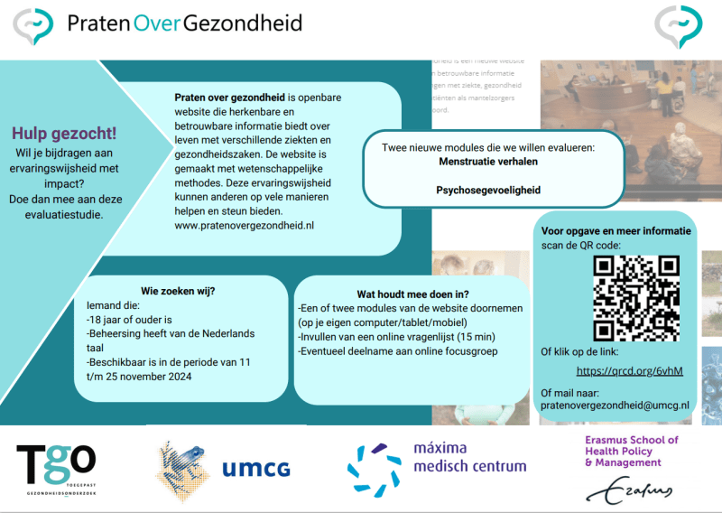 Van 11-25 november kun je de modules Menstruatieverhalen en/of psychosegevoeligheid bekijken. Daarna vragen we je om een vragenlijst in te vullen. Je kunt meedoen vanaf 16 jaar. Meer informatie vind je op de flyer.
