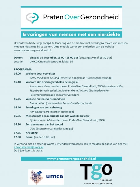 Tijdens deze middag zal onder andere gesproken worden over het belang van patiëntervaringen, de website PratenOverGezondheid en over ervaringen met chronische nierschade. Daarnaast wordt een preview gegeven op de ervaringsverhalen van de geïnterviewde nierpatiënten. De lancering wordt feestelijk afgesloten onder het genot van een hapje en een drankje.