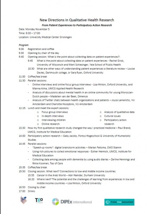 PratenOverGezondheid en DIPEx International organiseren op maandag 5 november in het UMCG een international symposium over New directions in qualitative health research – from patient experiences to participatory action research. U bent van harte welkom om dit symposium bij te wonen en met andere onderzoekers, studenten en zorgprofessionals nieuwe perspectieven, ervaringen en innovaties op het gebied van kwalitatief onderzoek te delen. Key-note speakers zijn Mark Schlesinger van Yale School of Public Health en Gaby Jacobs van de Universiteit voor Humanistiek. Meer informatie over het programma vindt u hier .